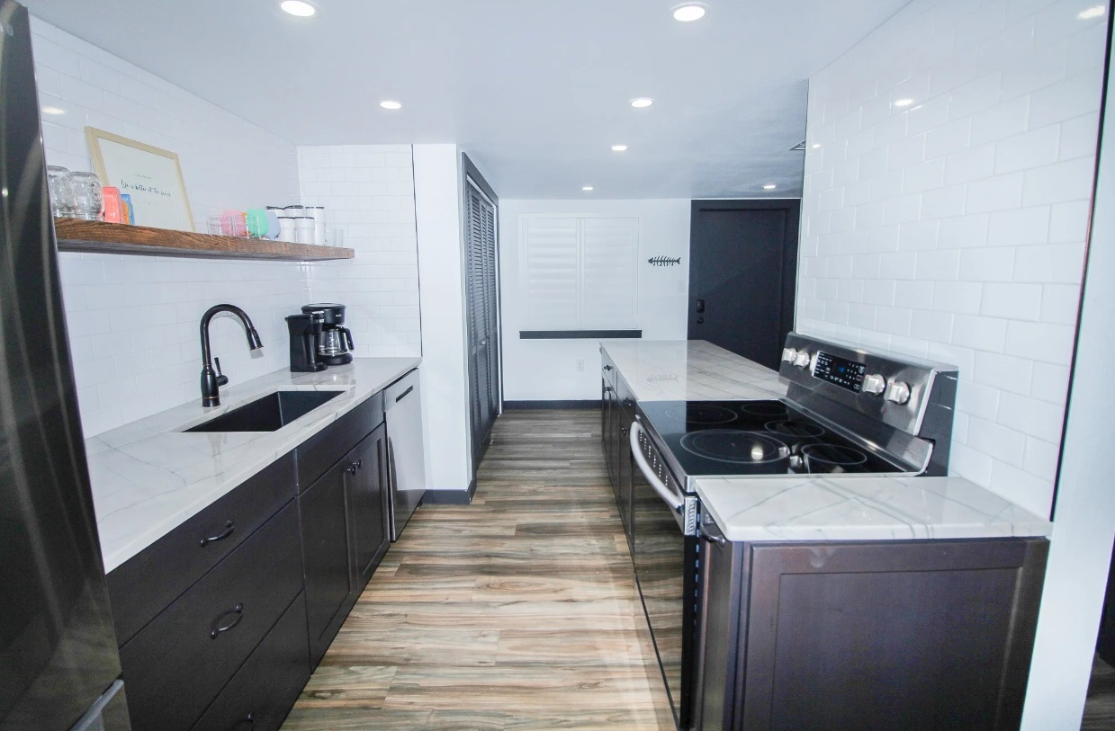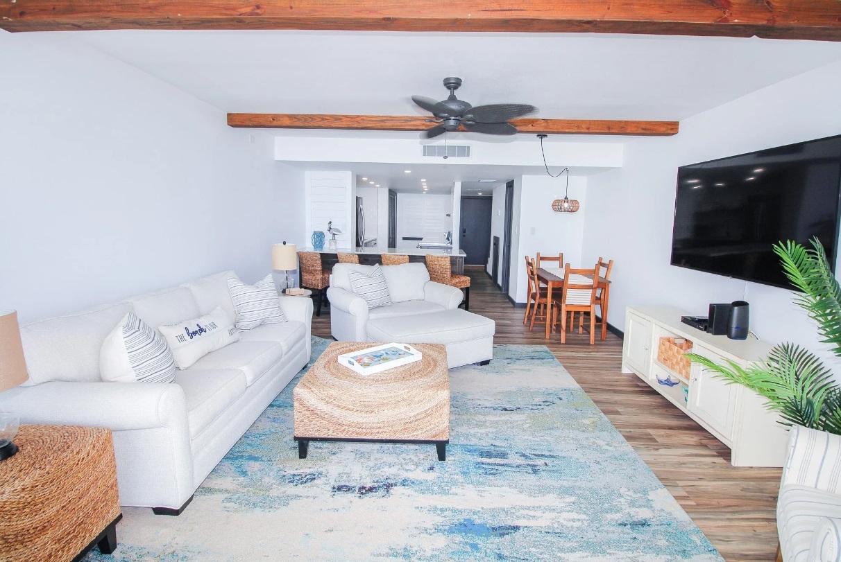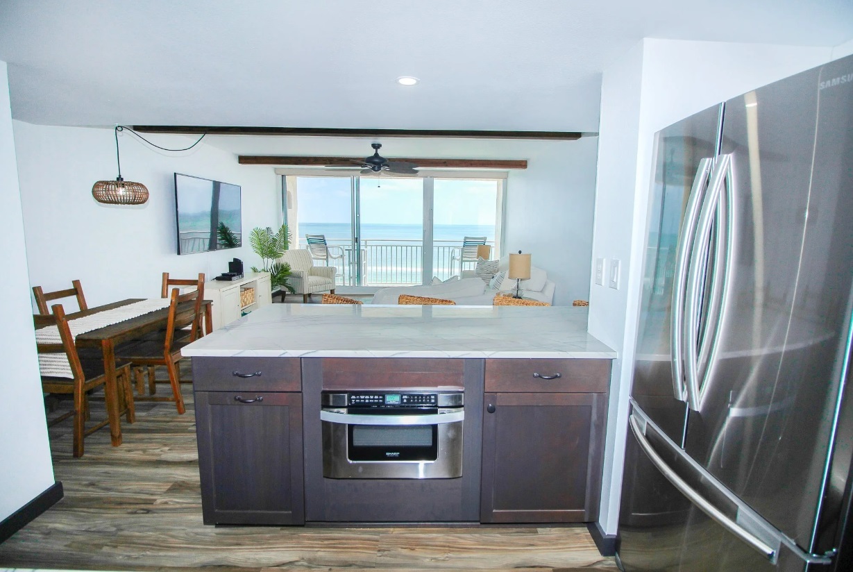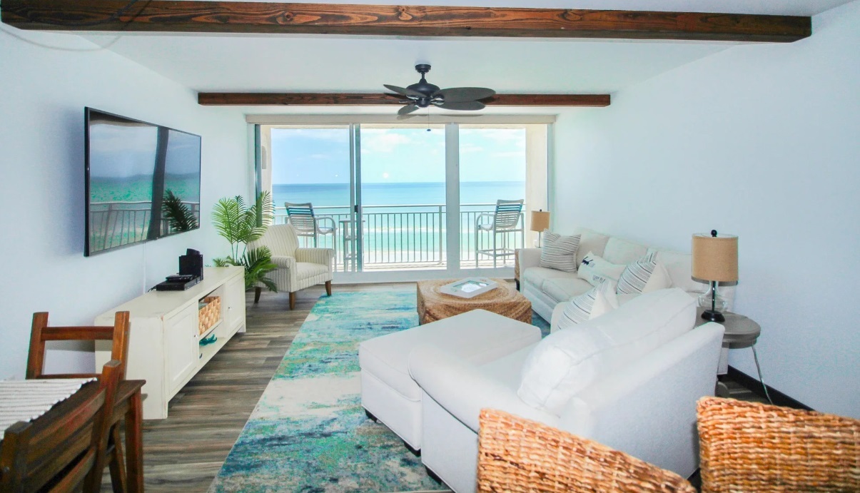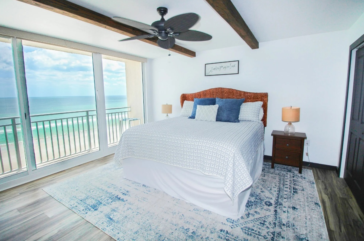 Step inside to be greeted by panoramic vistas from both the living area and master bedroom, where spectacular sunrises set the tone for luxurious coastal living. Completely RENOVATED and fully furnished as shown, this home boasts high-end finishes including custom cabinetry, quartz countertops, and refinished ceilings with recessed lighting. Brand new shades in the living area and master bedroom, along with plantation shutters on all west-facing windows, perfectly frame the expansive views. Wind-rated impact windows & sliding doors enhance comfort and safety.